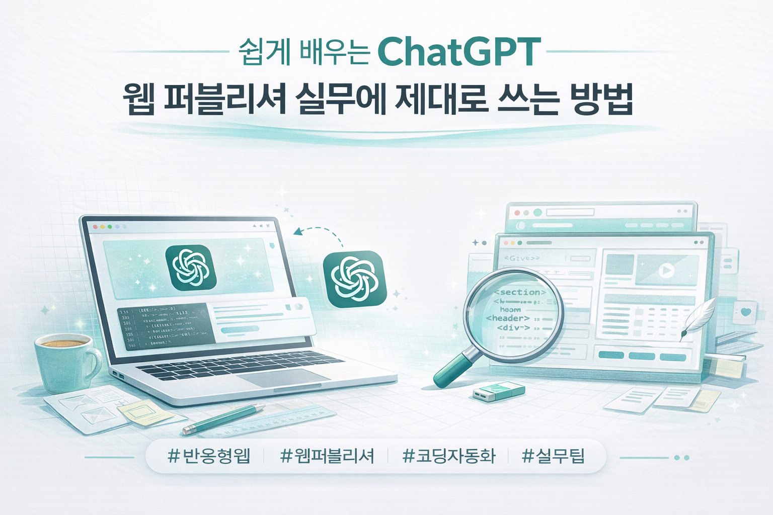 웹 퍼블리셔가 ChatGPT를 실무 자동화 도구로 활용하는 방법 정리. HTML 구조 생성, 반응형 설계, clamp 계산 자동화 예시 포함.